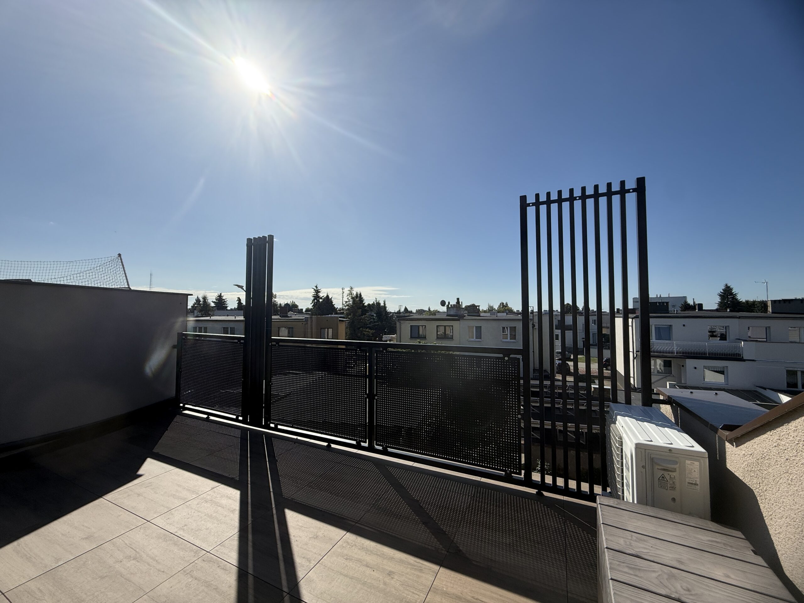 Charakterystycznym elementem realizacji są pionowe akcenty konstrukcyjne, które przełamują poziomą linię balustrady i nadają całości nowoczesny, architektoniczny charakter. Detale połączeń, mocowania oraz wykończenia krawędzi zostały wykonane z dużą precyzją, co widoczne jest zarówno z bliska, jak i w odbiorze całej bryły tarasu.