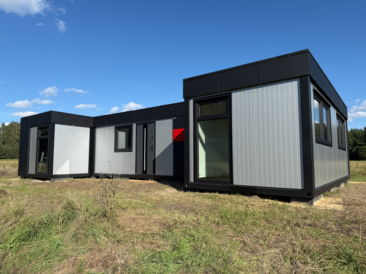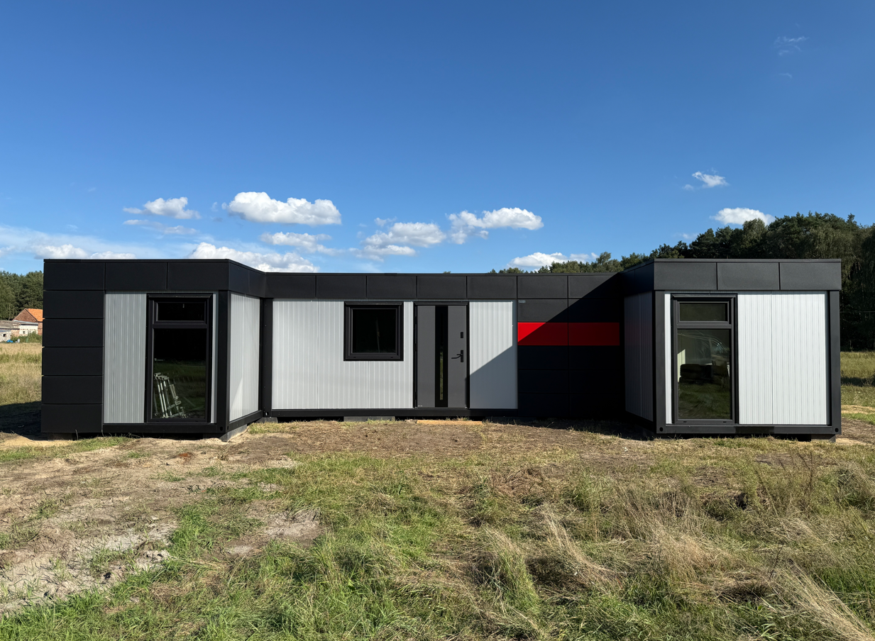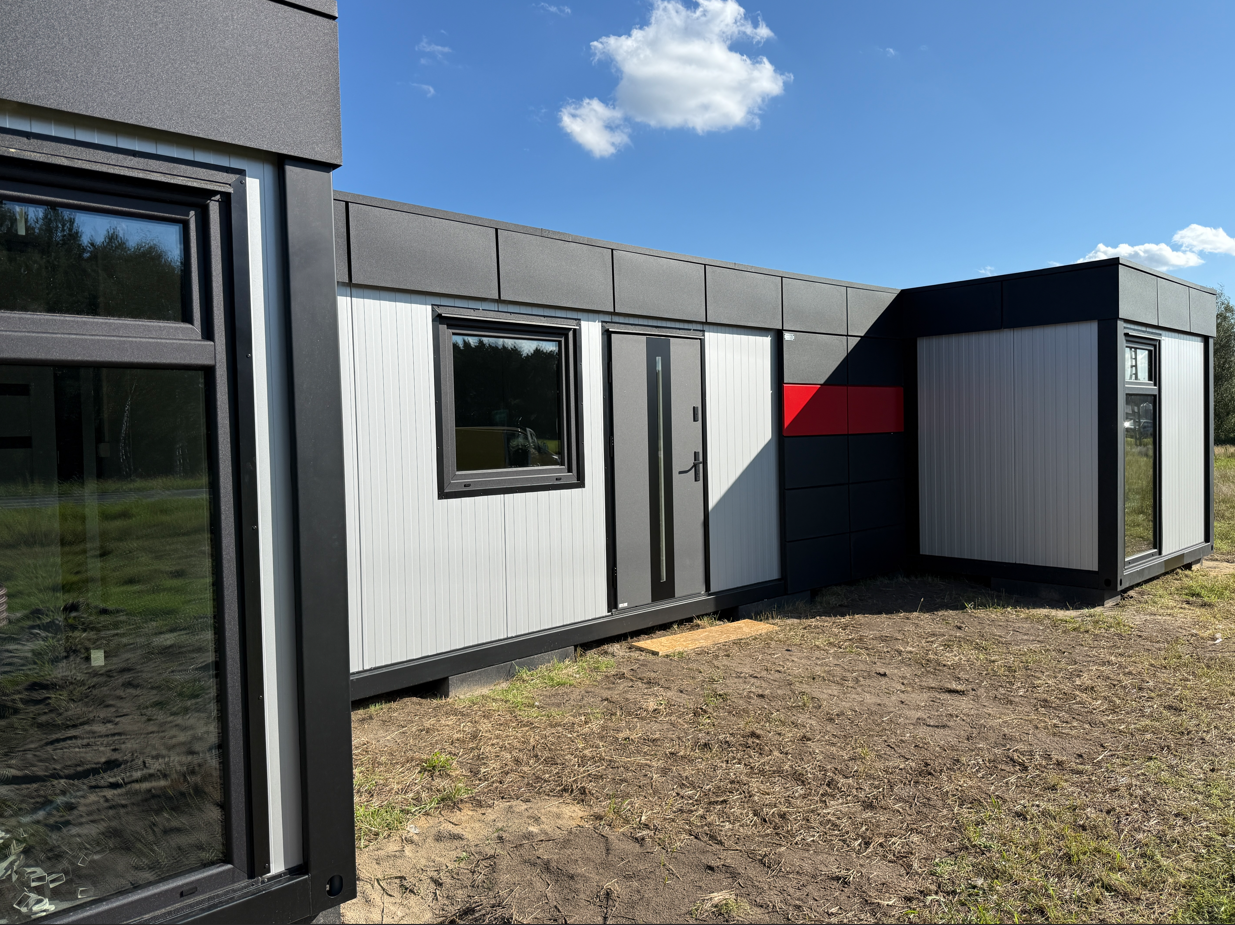 Zrealizowaliśmy nowoczesne biuro modułowe w kształcie litery H, zaprojektowane z myślą o komforcie pracy i czytelnym podziale funkcjonalnym. Układ obiektu obejmuje trzy niezależne pomieszczenia biurowe, przestronną salę konferencyjną, łazienkę oraz pomieszczenie socjalne z przygotowanymi przyłączami pod kuchnię. Całość tworzy spójną, logiczną przestrzeń biurową o łącznej powierzchni 63 m².