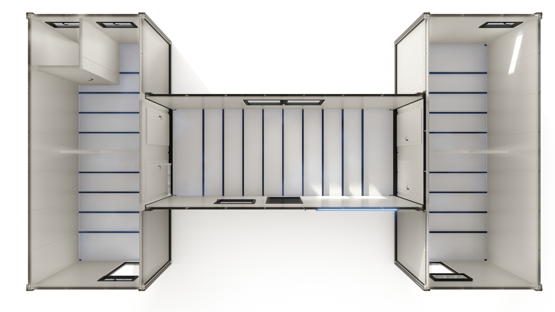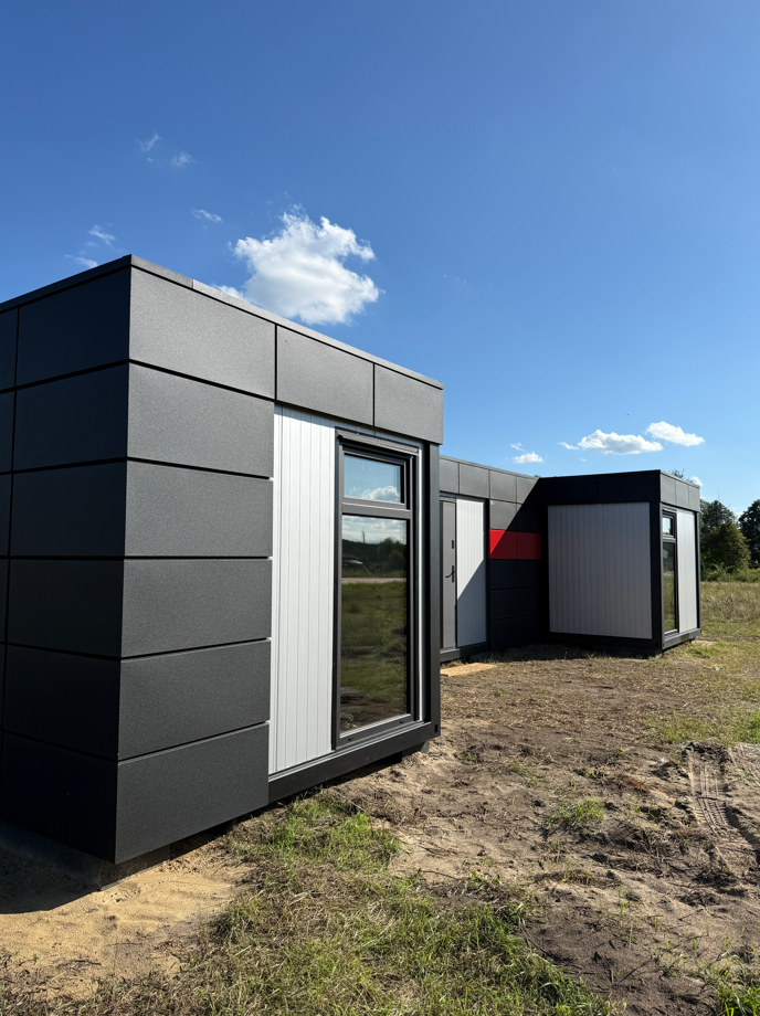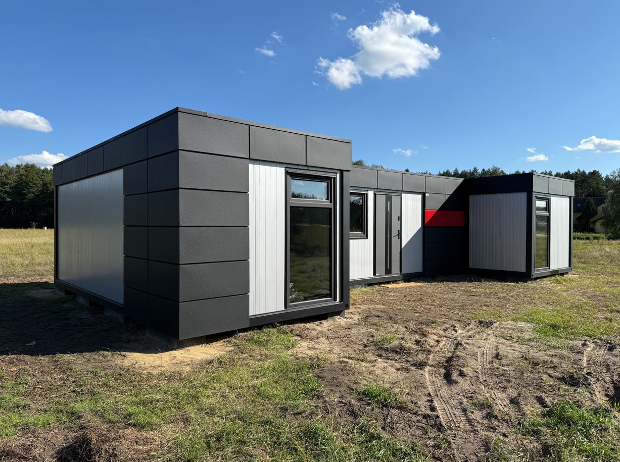 Zrealizowaliśmy nowoczesne biuro modułowe w kształcie litery H, zaprojektowane z myślą o komforcie pracy i czytelnym podziale funkcjonalnym. Układ obiektu obejmuje trzy niezależne pomieszczenia biurowe, przestronną salę konferencyjną, łazienkę oraz pomieszczenie socjalne z przygotowanymi przyłączami pod kuchnię. Całość tworzy spójną, logiczną przestrzeń biurową o łącznej powierzchni 63 m².