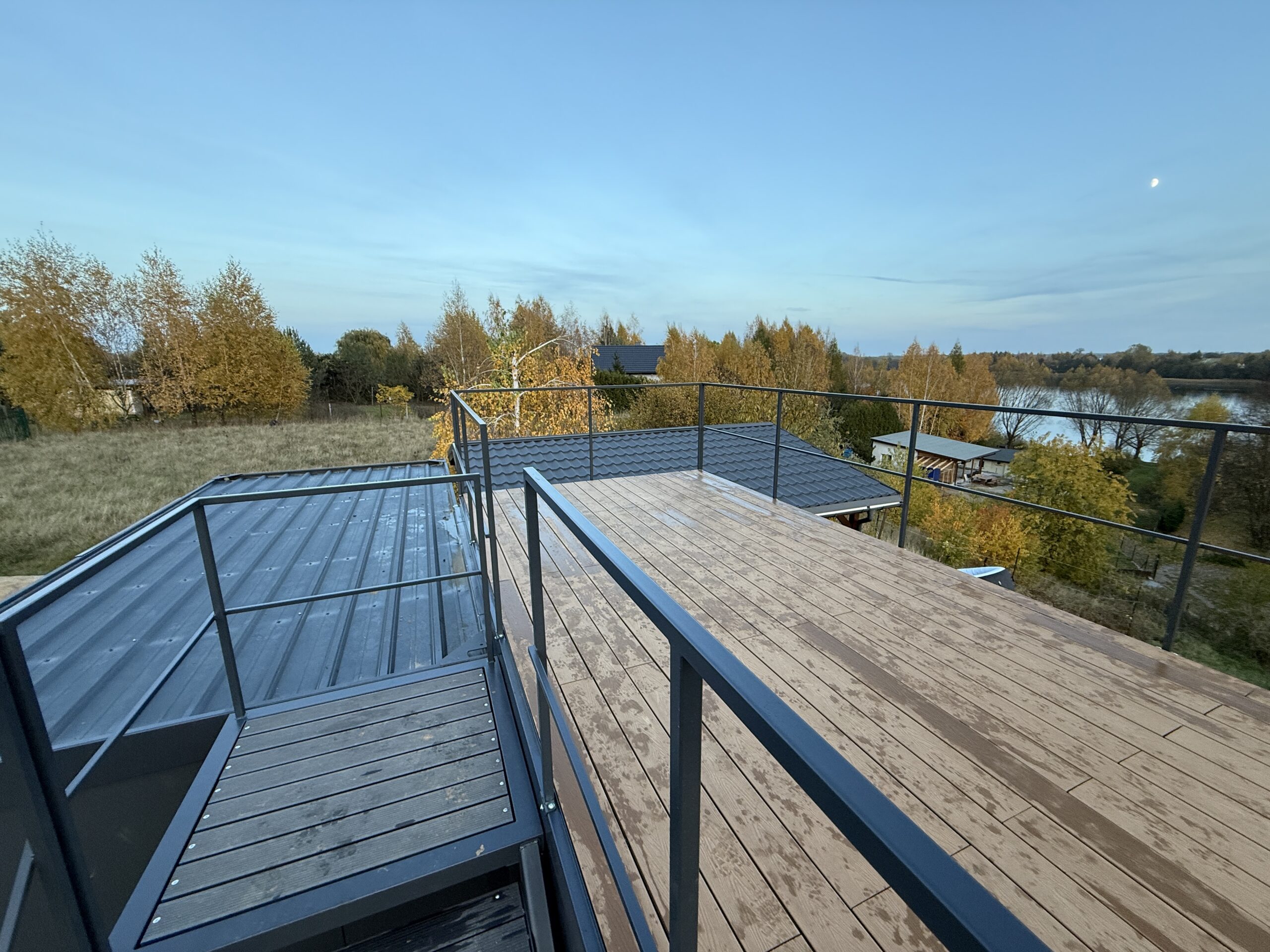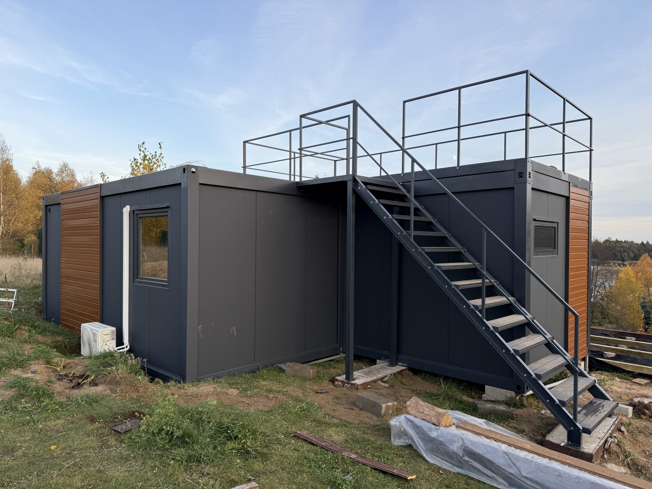 Dodatkowym atutem realizacji jest taras zlokalizowany na jednym z modułów, dostępny za pomocą zewnętrznych schodów. To rozwiązanie znacząco zwiększa funkcjonalność obiektu, oferując dodatkową przestrzeń rekreacyjną i widokową, bez ingerencji w układ wnętrza. Całość stanowi przykład przemyślanego domu modułowego, który łączy kompaktowy metraż z poczuciem przestrzeni i wysoką estetyką.