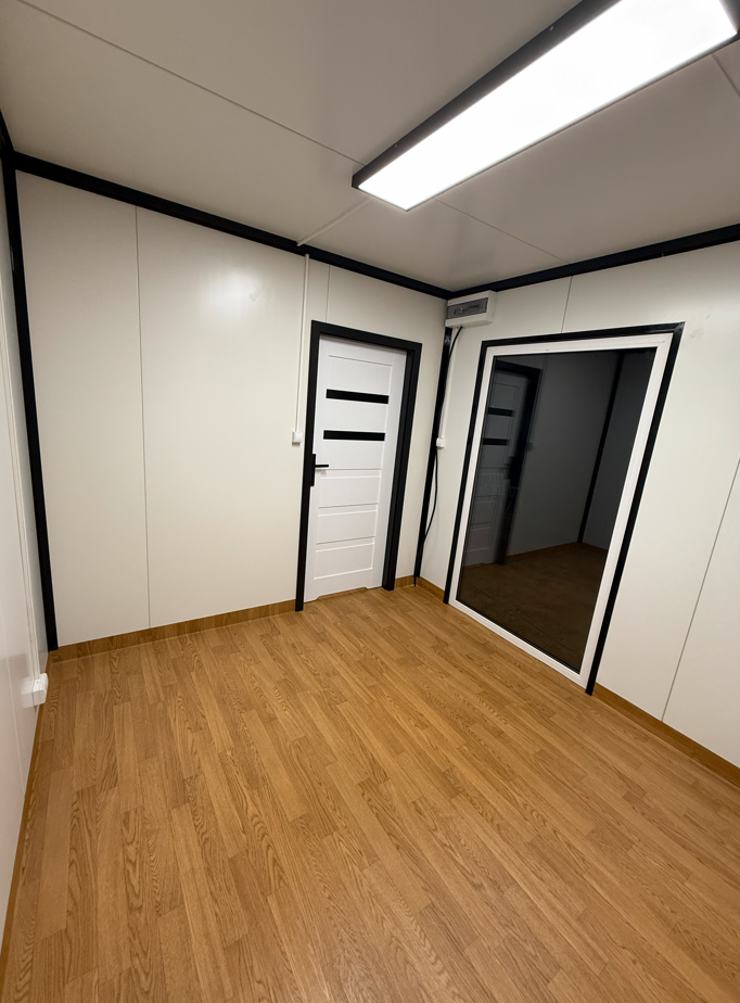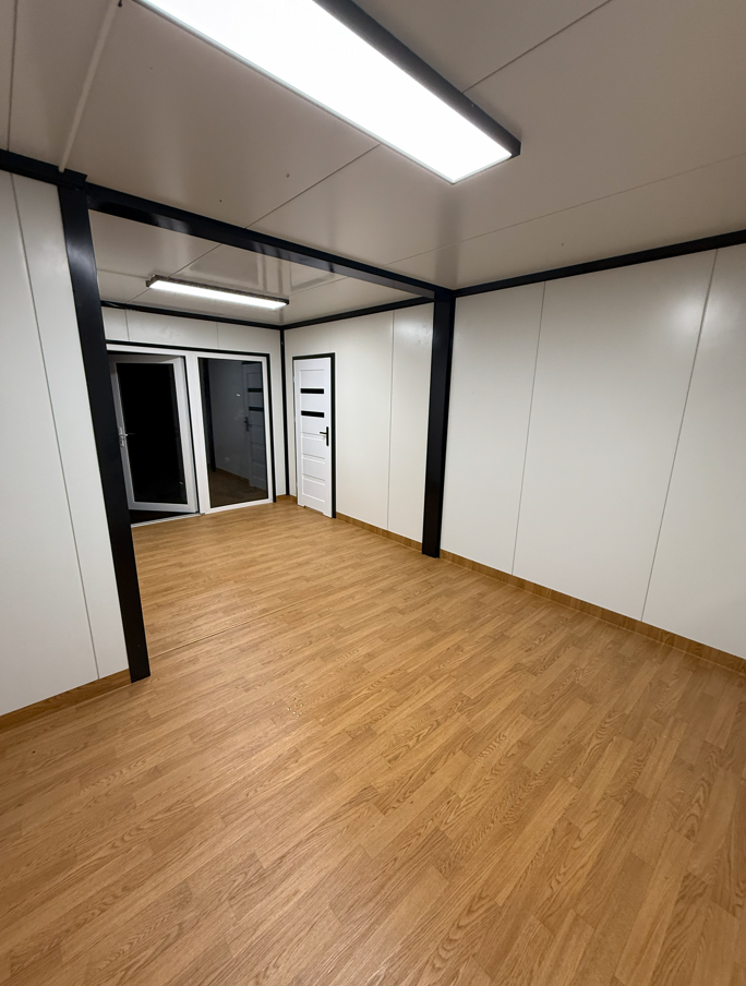 Zrealizowaliśmy domek modułowy o powierzchni 42 m², oparty na układzie z lekkim przesunięciem modułów, które pozwoliło uzyskać wyjątkowo komfortową i otwartą strefę dzienną. W centralnej części zaprojektowano przestronny salon, a układ uzupełnia jedna sypialnia oraz funkcjonalna łazienka, tworząc pełnowartościową przestrzeń do całorocznego użytkowania.