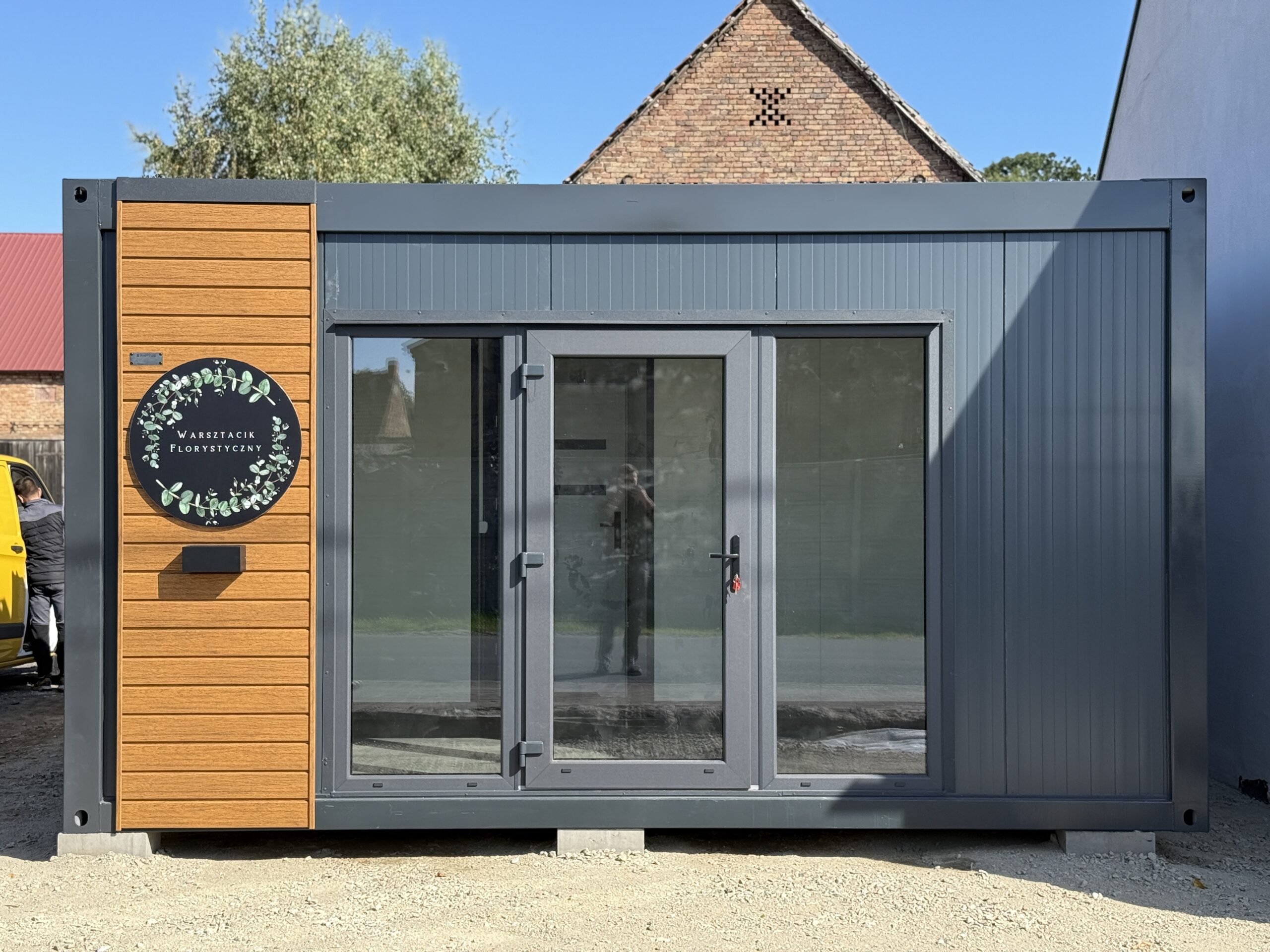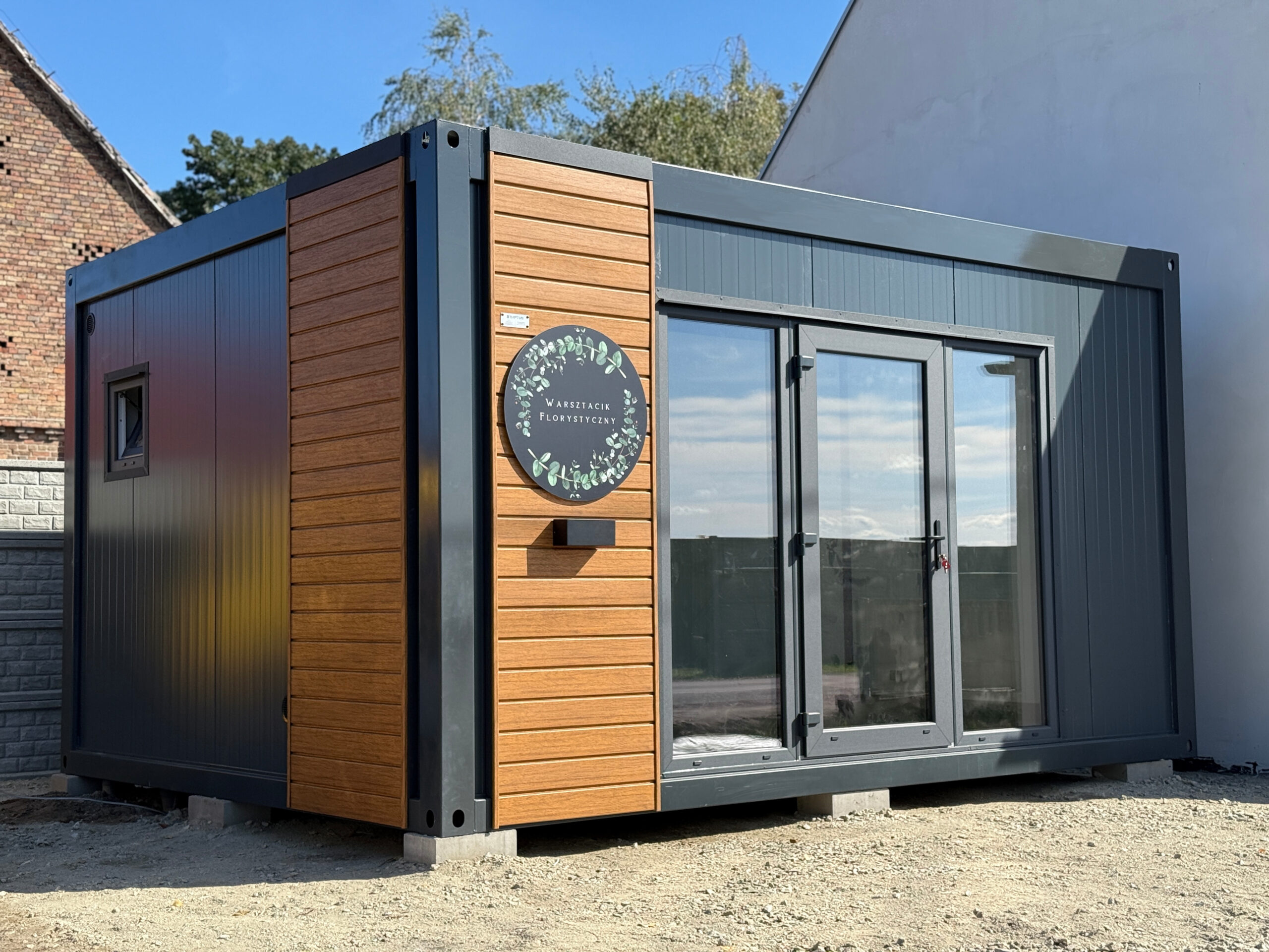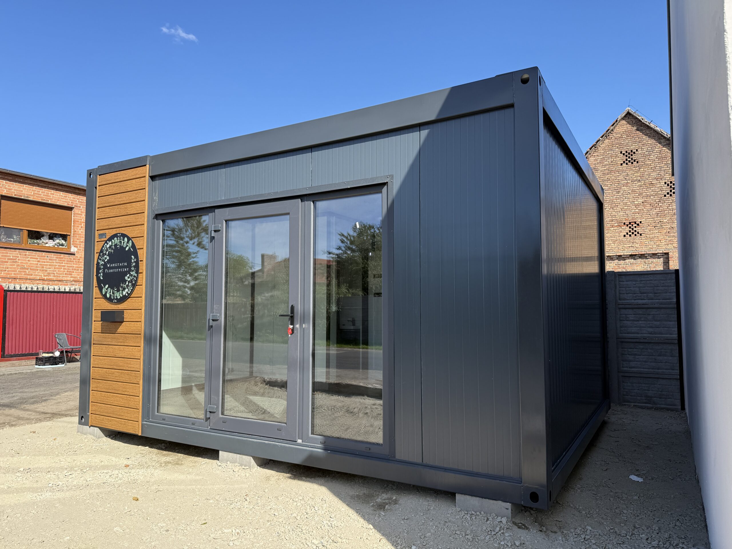 Kontenerowa pracownia florystyczna o wymiarach 5 × 4 m to kompaktowy, a jednocześnie w pełni funkcjonalny obiekt zaprojektowany z myślą o codziennej pracy florysty oraz bezpośredniej obsłudze klientów. Prosta bryła została przełamana dużymi przeszkleniami, które doskonale doświetlają wnętrze i naturalnie eksponują przestrzeń sprzedażową od strony ulicy.