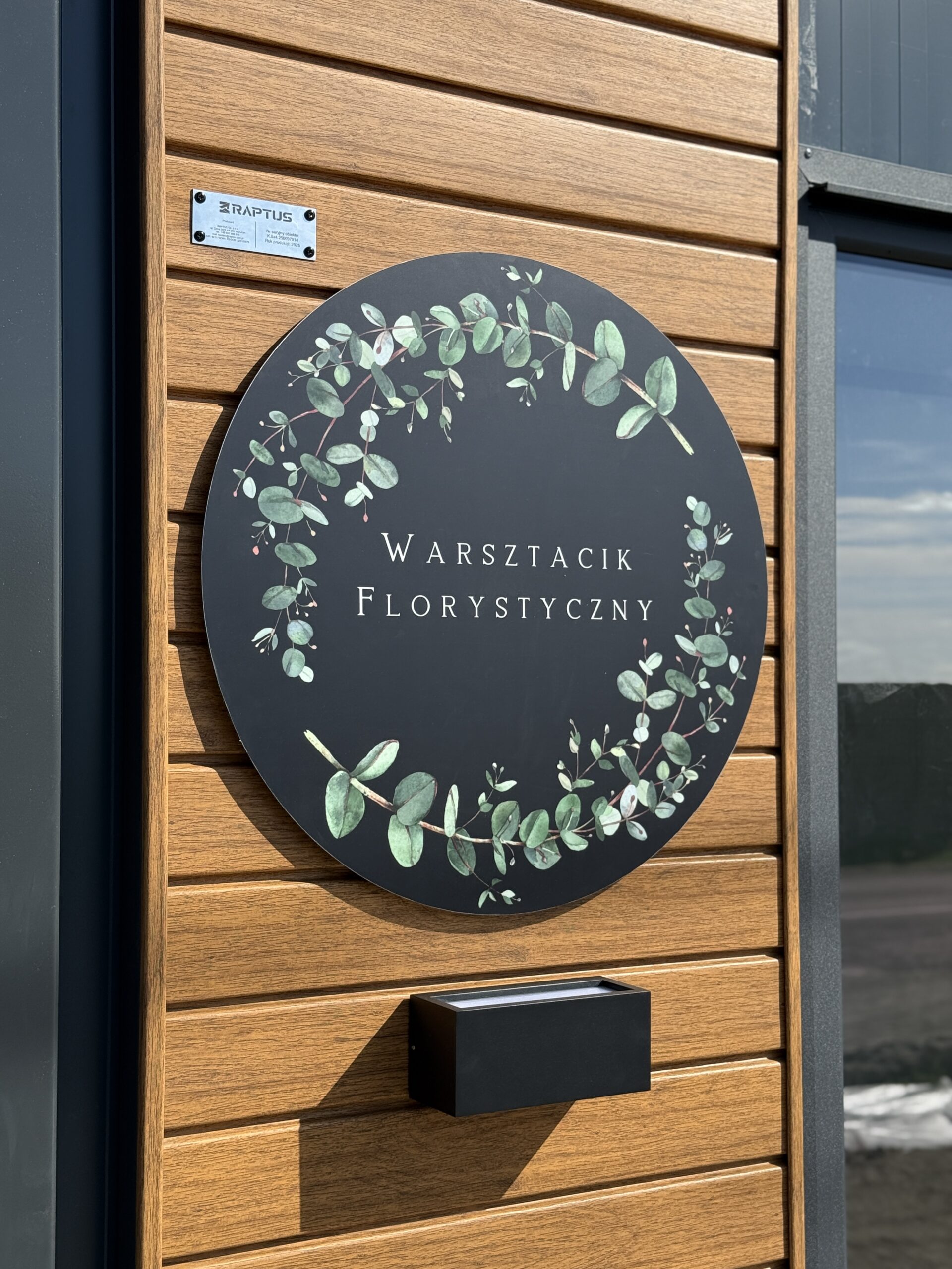 Elewację wykonano w nowoczesnej, stonowanej kolorystyce, uzupełnionej o dekoracyjne panele elewacyjne imitujące drewno w kolorze winchester. Całość dopełnia indywidualny element identyfikacji wizualnej w postaci szyldu z nazwą „Warsztacik Florystyczny”, zamontowanego na drewnianej wstawce elewacyjnej, który podkreśla charakter obiektu i wzmacnia jego rozpoznawalność.