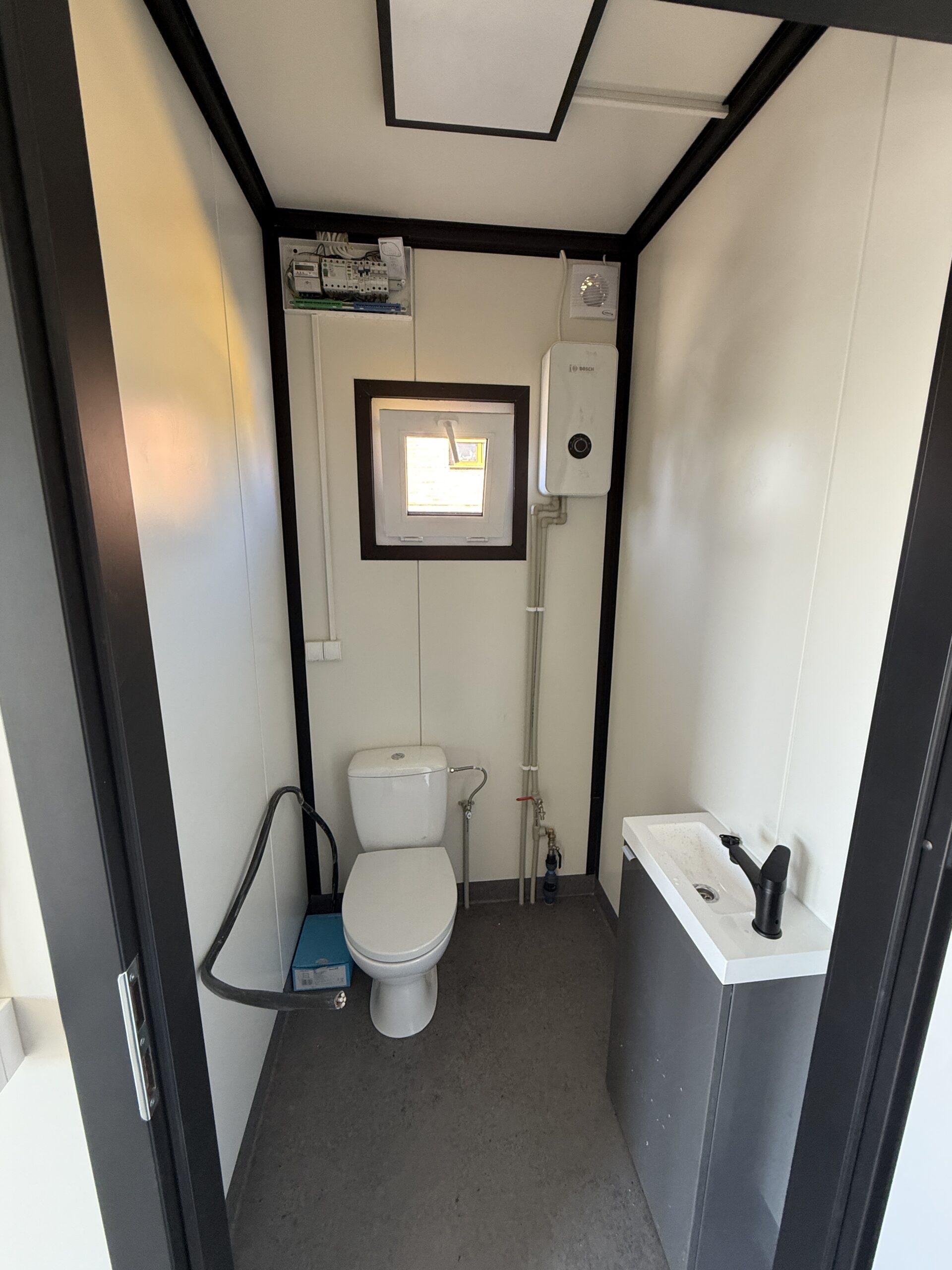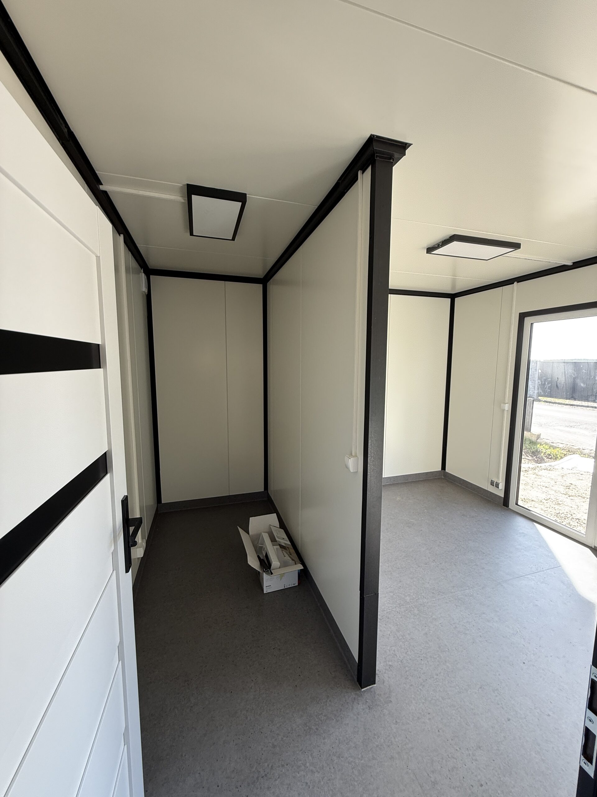 W późniejszym etapie realizacja została rozbudowana o lekkie zadaszenie, tworzące dodatkową, funkcjonalną strefę wejściową i zwiększające komfort użytkowania obiektu niezależnie od warunków atmosferycznych. To przykład elastycznego podejścia do projektowania obiektów kontenerowych, z możliwością dalszej rozbudowy i dopasowania do potrzeb inwestora.