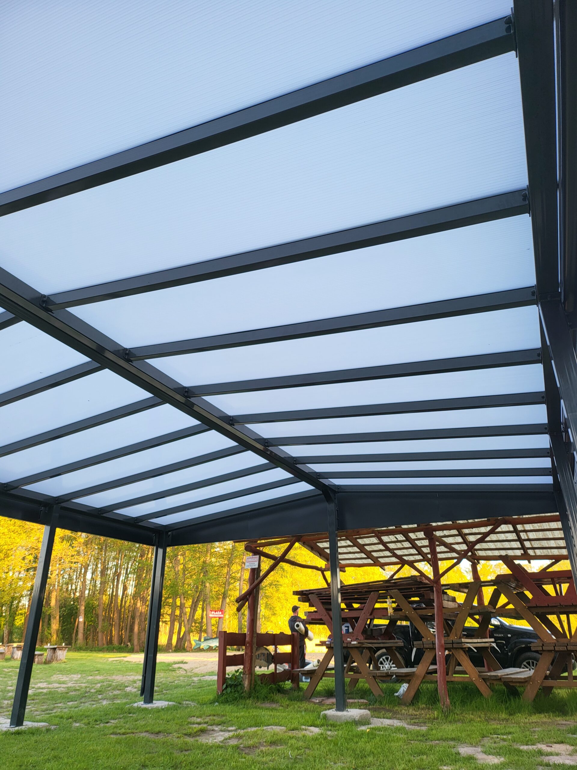Dach zadaszenia wykonano z poliwęglanu, który zapewnia bardzo dobre doświetlenie strefy gastronomicznej, jednocześnie chroniąc gości przed deszczem i nadmiernym nasłonecznieniem. Transparentne poszycie pozwala zachować lekkość wizualną konstrukcji i bliskość otaczającej przyrody, co ma szczególne znaczenie w lokalizacji plażowej.