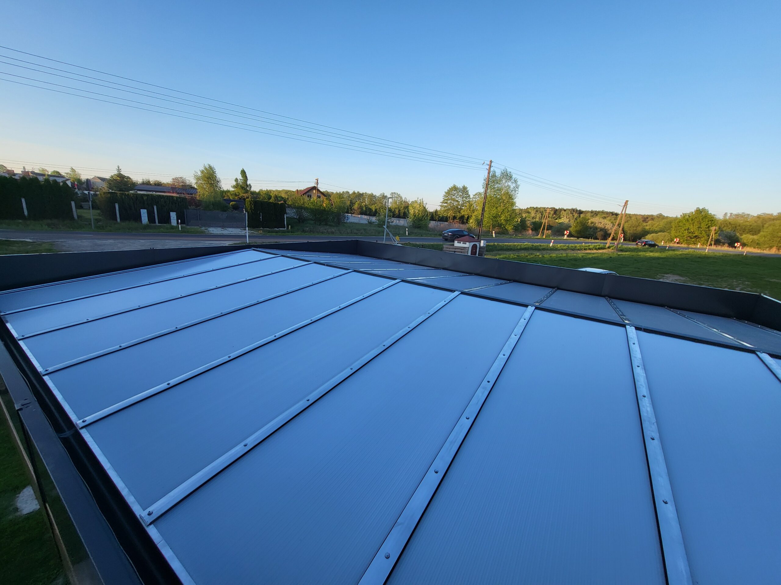 Istotnym elementem projektu jest attyka z blachy, która pełni zarówno funkcję estetyczną, jak i praktyczną. Dzięki niej spad dachu został całkowicie ukryty, co nadaje bryle nowoczesny, czysty wygląd i sprawia, że konstrukcja prezentuje się jako spójna, geometryczna forma. Attyka estetycznie domyka całość i podnosi wizualny standard realizacji.